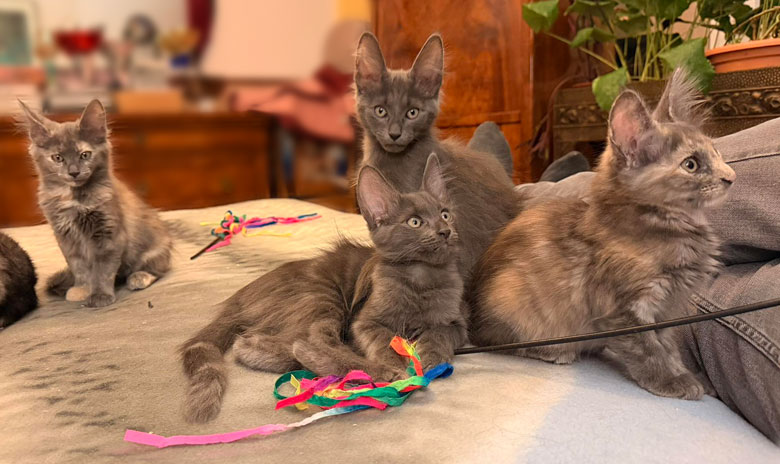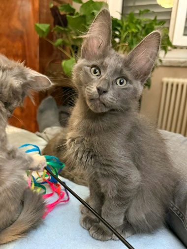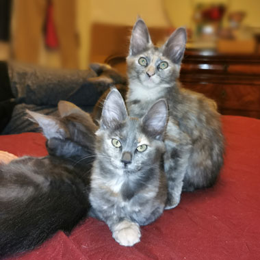 Ils sont nés sur mon lit, ont grandi dans ma chambre avant de rejoindre, quand leur mère le désire, le reste de la troupe vivant dans le reste de l'appartement. Ils sont disponibles à partir de leur trois mois révolus et sont vaccinés typhus-coryza pour un an. Ils ont un pedigree inscrit au livre des Origines Suisse édité par le Cat Club de Genève et reconnu par les autres clubs, notamment le LOOF |