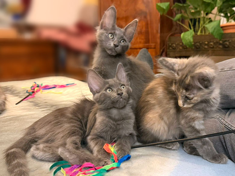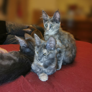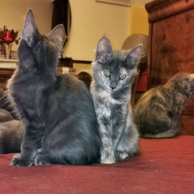 Ils sont nés sur mon lit, ont grandi dans ma chambre avant de rejoindre, quand leur mère le désire, le reste de la troupe vivant dans le reste de l'appartement. Ils sont disponibles à partir de leur trois mois révolus et sont vaccinés typhus-coryza pour un an. Ils ont un pedigree inscrit au livre des Origines Suisse édité par le Cat Club de Genève et reconnu par les autres clubs, notamment le LOOF |